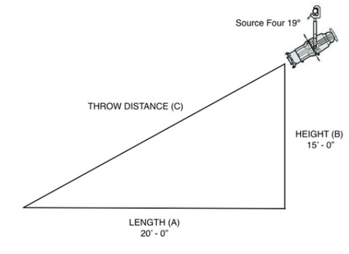 Diagram showing throw distance, mounting height and stage length for a 19-degree spotlight.