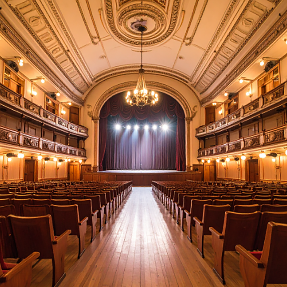 Classic theatre interior showing stage, audience seating and architectural ceiling.
