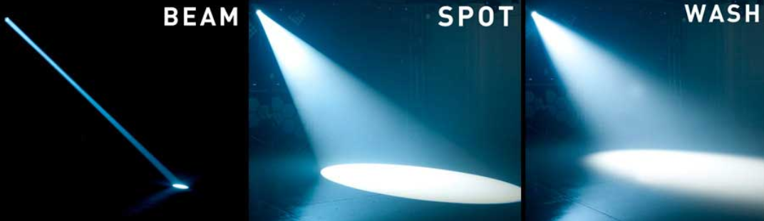 Beam, spot and wash stage light beams compared side by side.
