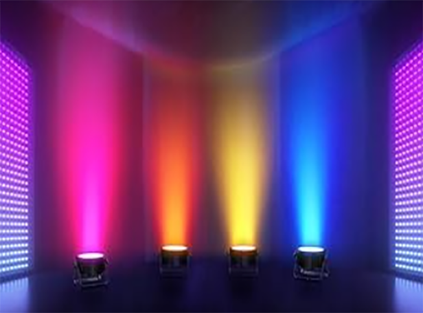 LED PAR uplights washing a wall with different colors beside LED pixel panels
