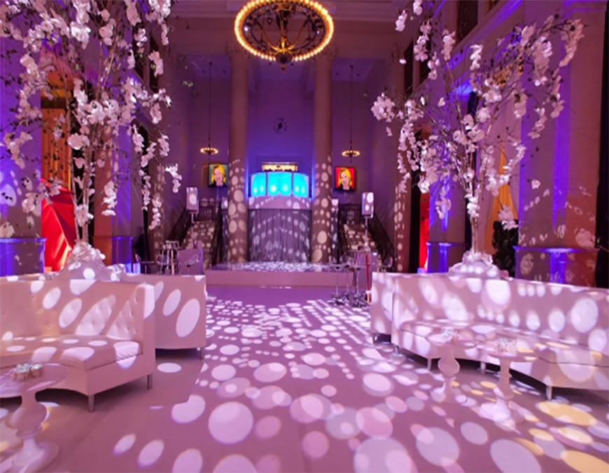 Event space with circular gobo patterns projected on the floor and walls.