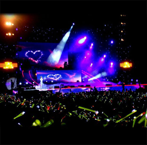 Intro (Build-up): Stage lights wash the arena in a tranquil blue. A single front light spotlights the singer.
